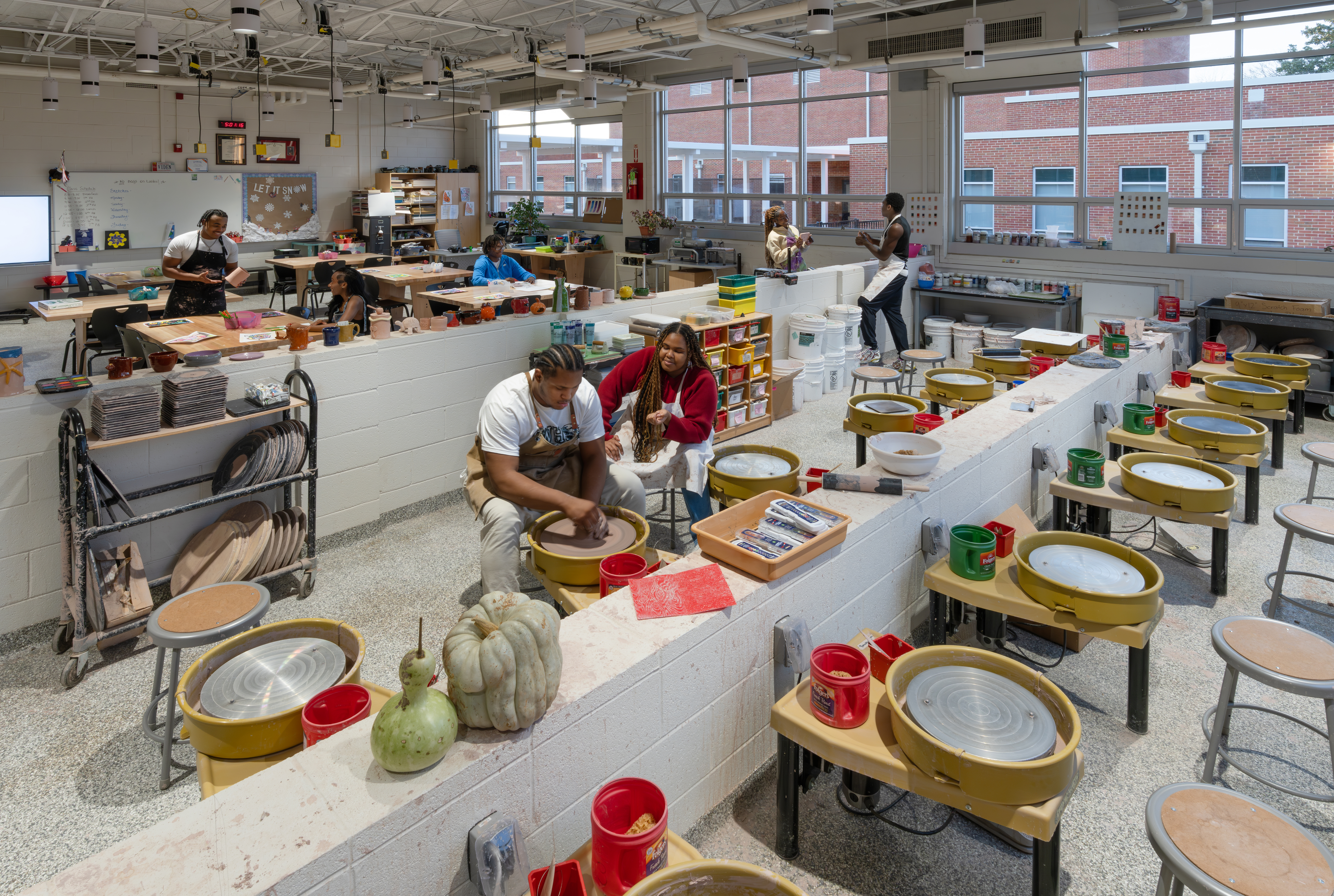The JROTC building, which is located next to the CTE building, had spaces that were underutilized. Our team upgraded the space entirely and converted unused rooms into an art studio and dance studio to support the exploratory programs. A beautifully renovated auditorium provides a space for the arts to thrive.