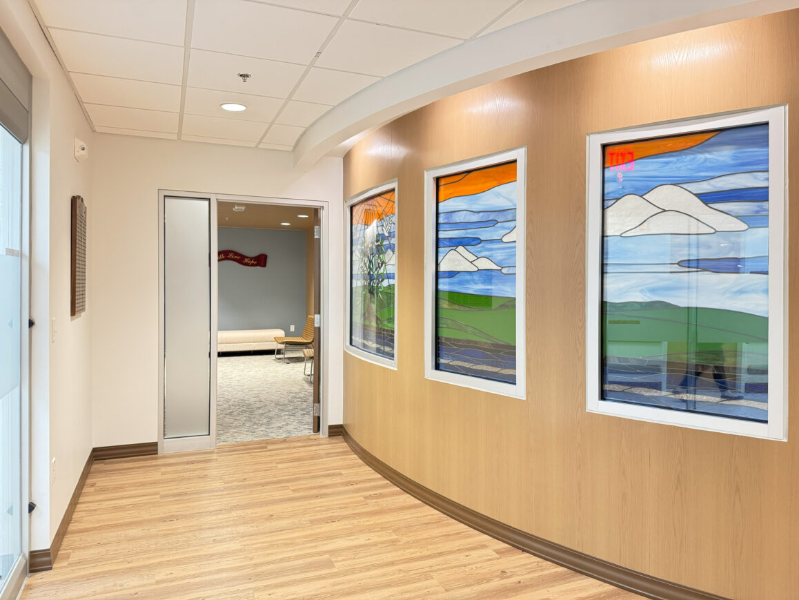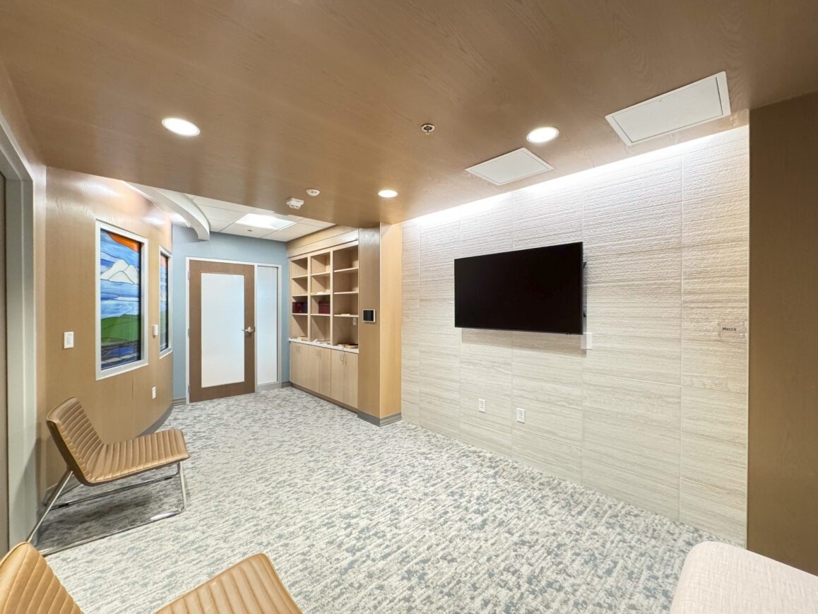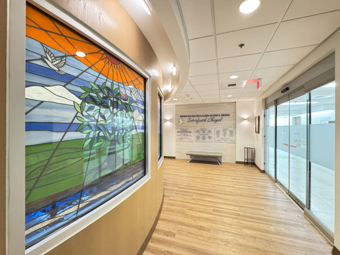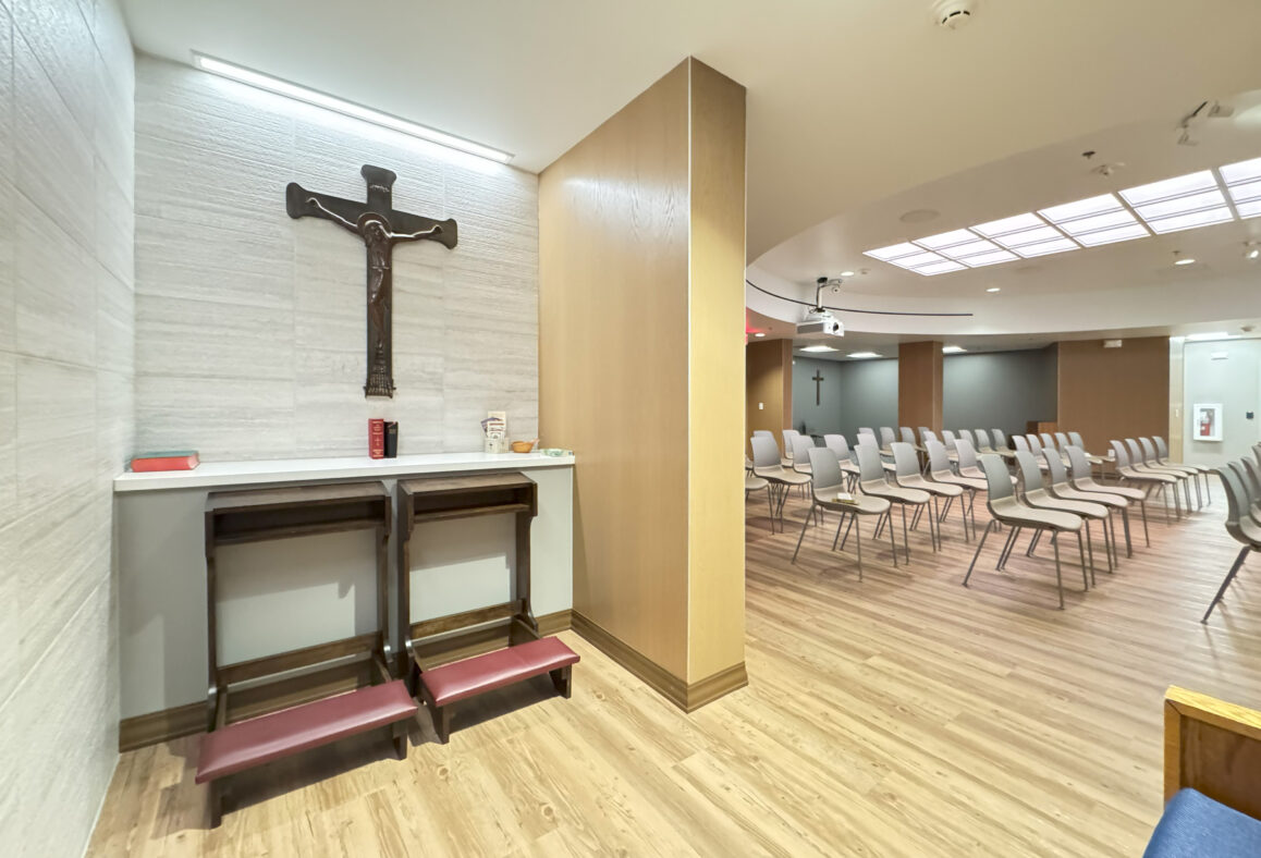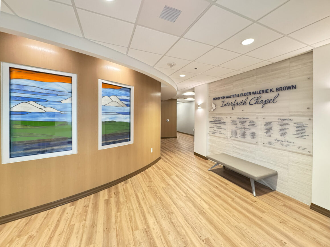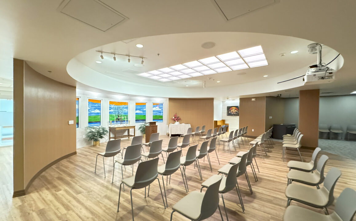 Along with complete architectural, interior design, and engineering services, RRMM also provided design assistance for the owner’s FF&E selections and for a comprehensive, state-of-the-art technology package. While the chapel is on the first floor of the hospital, the main overhead fixture contains multiple settings to simulate natural daylight.