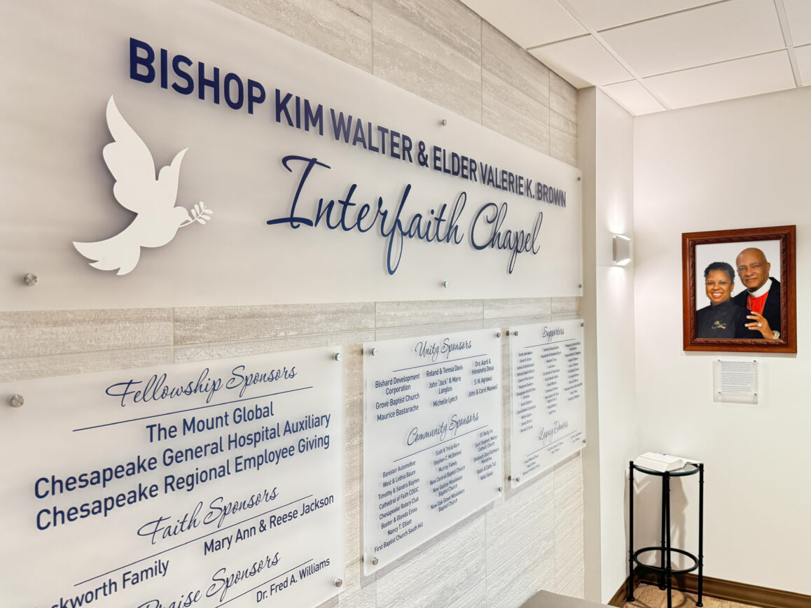 Another challenge was Chesapeake Regional Health’s desire for a spiritual, interfaith space that welcomes and serves all potential users. As part of initial programming, RRMM participated in multiple meetings with representatives from various faith communities. The chapel presents an inclusive environment while also accommodating specific faith requirements such as hand washing and prayer orientation. The chapel is also flexible. It provides a variety of spaces – small, large, private, open – to accommodate private, intimate moments as well as large scale events. The design includes a private prayer area, a meditation room, an office, and a conference room. Soft lighting elements were carefully integrated to emulate natural skylight, creating a serene and uplifting atmosphere for reflection and worship.