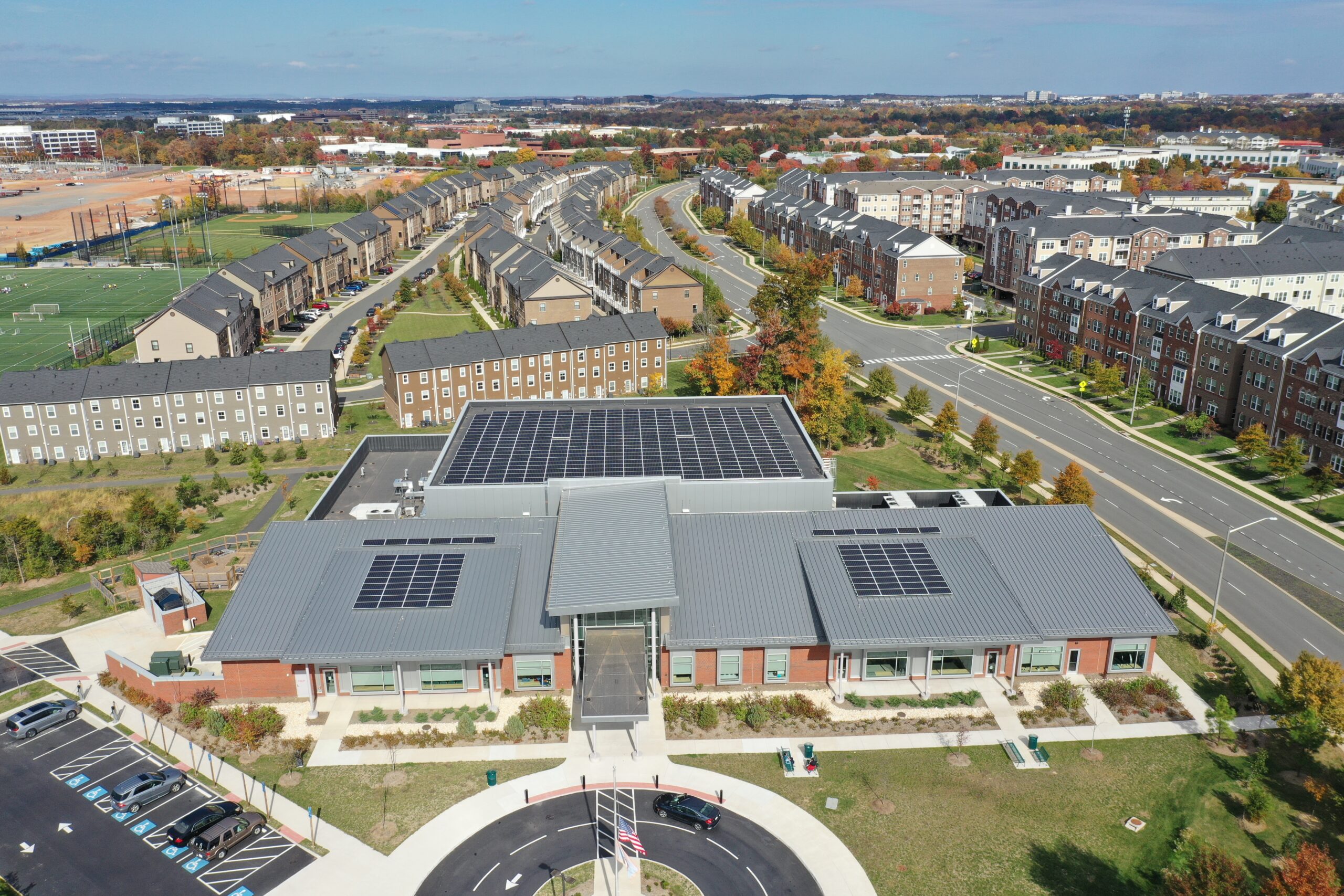 The project certified LEED Gold. Sully Community Center features a large solar array on the standing metal sloped roofs and the gym roof that generates 66% of the electricity required by the facility.